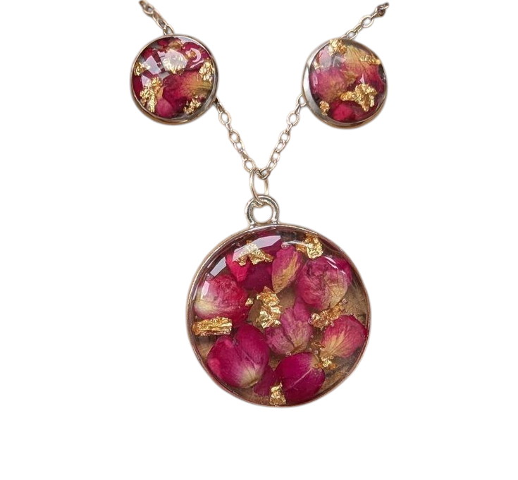 Celebrate timeless beauty with our handcrafted Rose Petal Resin Pendant Set, made using real preserved rose petals delicately encased in crystal-clear resin. Each piece captures the natural charm and romantic essence of roses, creating a wearable keepsake that feels both elegant and meaningful.